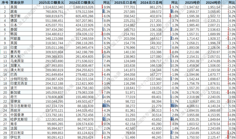2025年紧固件出口目的地前30强合计出口额93.36亿美元,占总出口额78.3%,占比较2024年(79.6%)微降,市场分布正趋于分散,企业正在积极开拓新市场。